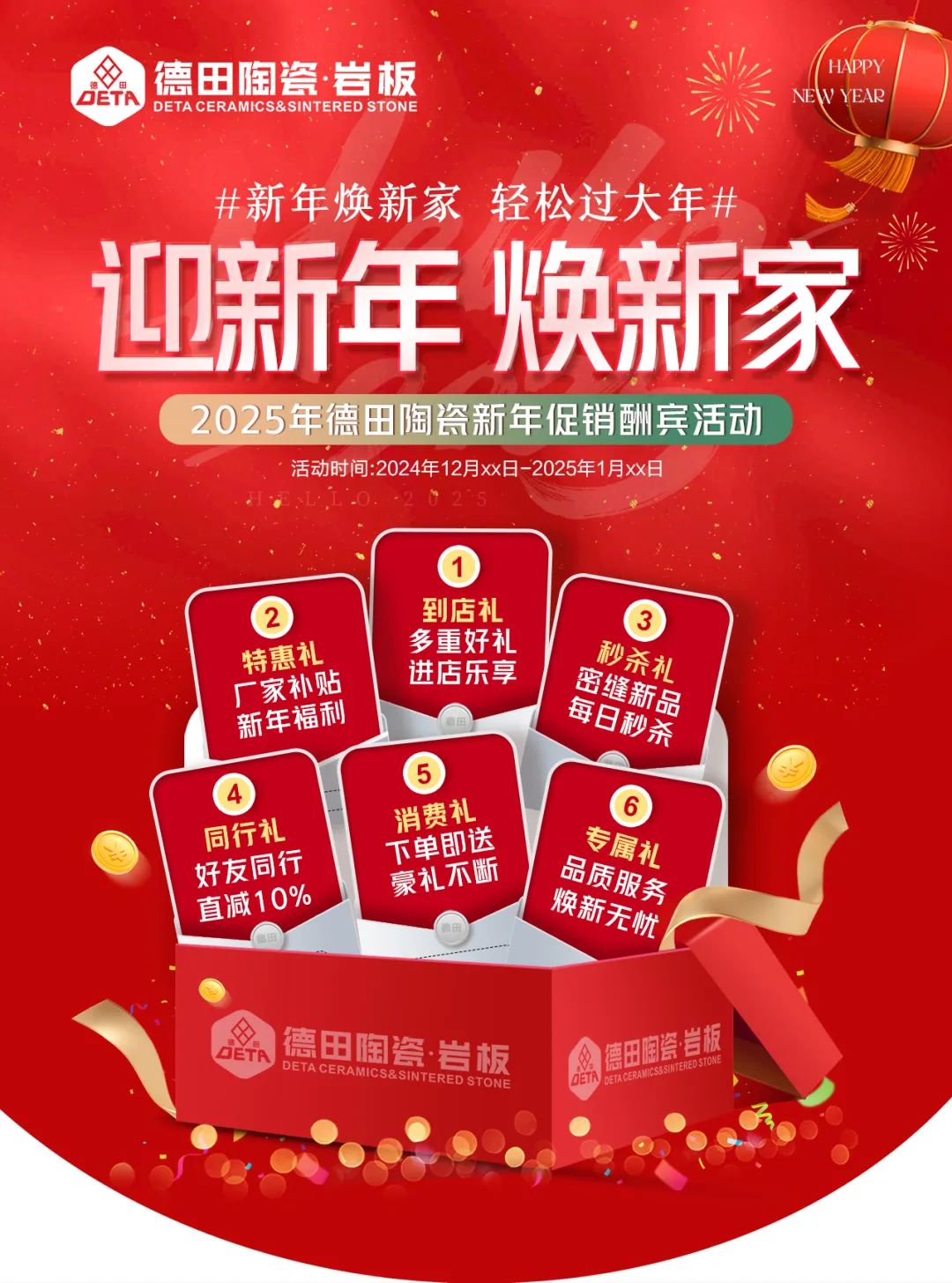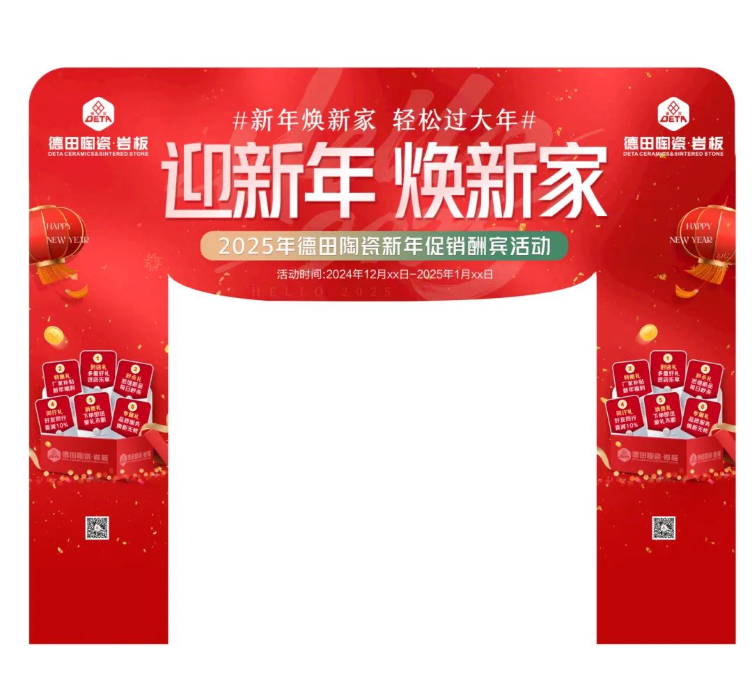 致經(jīng)銷商們:Happy New Year為了迎接新年元旦銷售節(jié)點,更好地配合廣大經(jīng)銷商開展促銷活動,營造濃郁的促銷氛圍,搶占市場,德田陶瓷發(fā)起“迎新年,煥新家”促銷活動,并推出系列促銷方案及物料,含拱門、單張、展架、貼紙等整套源文件。