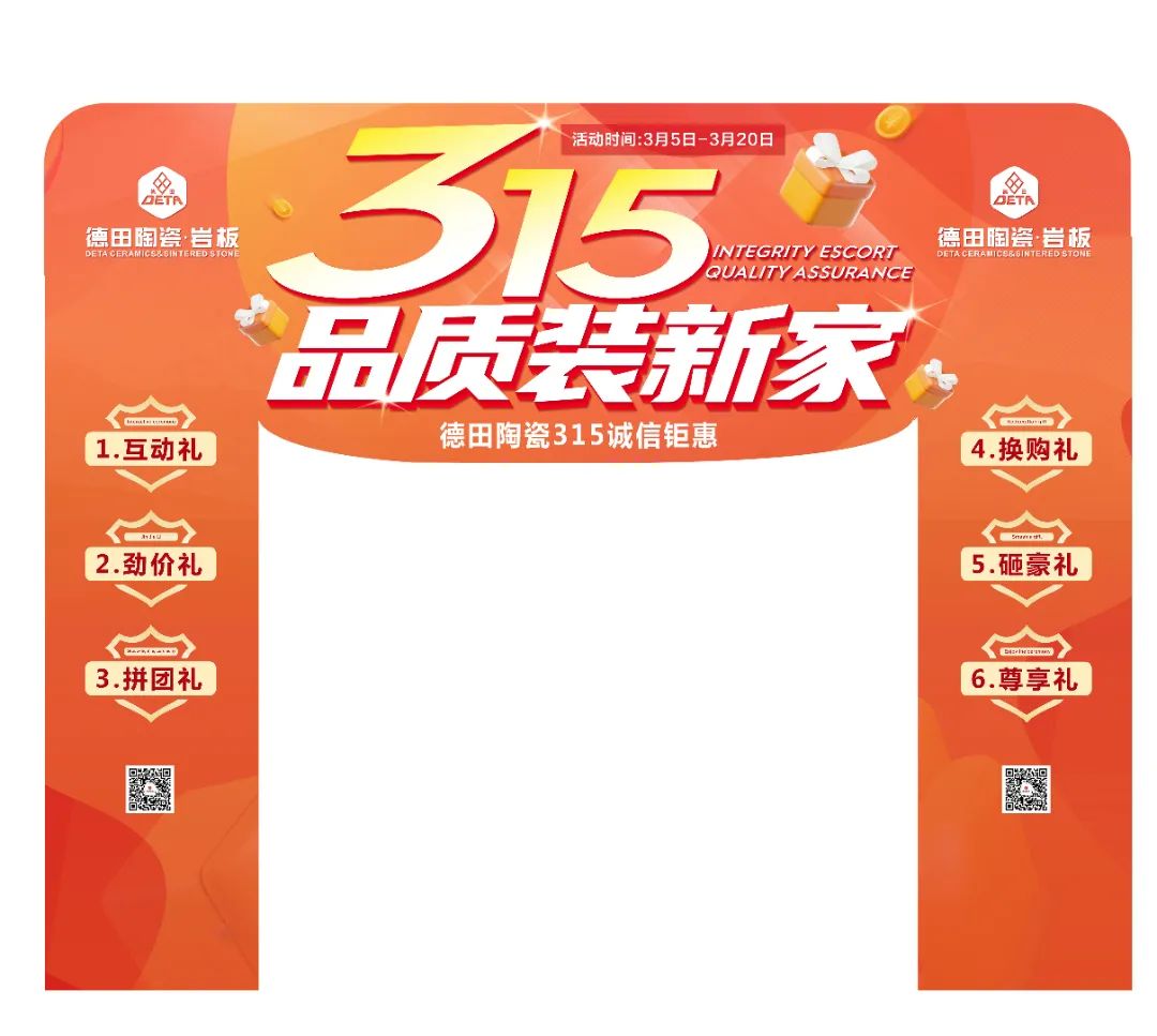 為了更好地配合各地經銷商開展3·15促銷活動,助力終端店面營造濃郁的活動促銷氛圍、抓住開春時機,搶占市場,贏得門店銷售開門紅,德田陶瓷推出系列促銷方案及設計了3·15氛圍相關物料(含拱門、單張、展架、貼紙等整套源文件)供各位經銷商朋友使用。請各經銷商家人們咨詢所屬區域經理領取,并在當地進行制作。(方案內容僅供參考,經銷商可根據自身實際需要作出調整)